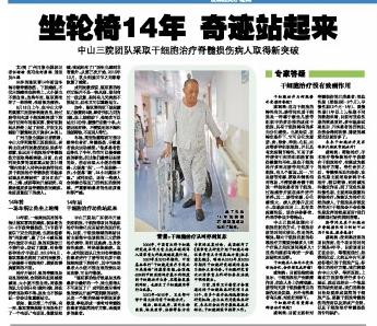 截止到目前,在中山大学附属第三医院骨科病房里,64岁的陈双喜经过脐带间充质干细胞蛛网膜下腔治疗后,奇迹般地从轮椅上站了起来,并在支具辅助下缓慢地迈开脚步。