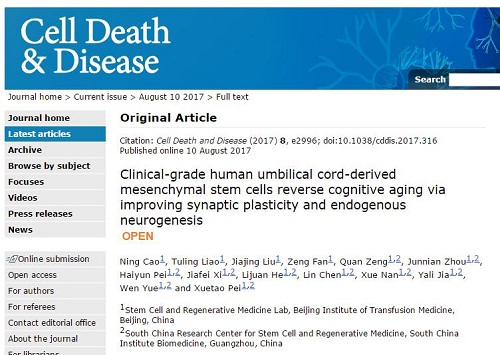 近日,中国科学家在新一期《细胞死亡和疾病》(Cell Death & Disease)杂志上报告了临床级人类脐带间充质干细胞对衰老小鼠模型认知老化的干预作用。