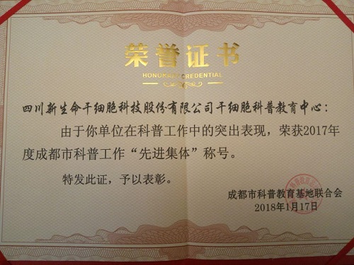 2017年9月,成都市民政局批复组建,成都市科学技术局指导开展工作的“成都市科普教育基地联合会”宣告成立,新生命干细胞科普教育中心荣膺副会长单位,四川新生命干细胞科技股份有限公司分管科普教育工作的副总经理张静女士也受聘成为成都市科普教育基地联合会第一届理事会副会长。