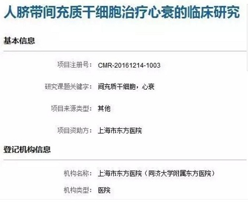 上海市东方医院备案的脐带间充质干细胞治疗心衰的临床研究是我国首次探讨脐带间充质干细胞治疗心衰效果的研究,在这项研究中,院方将招募10位70岁以下符合条件的缺血性心脏病患者,在全麻情况下进行冠状动脉旁路移植术,同时分20点将脐带间充质干细胞注射至心肌梗死区边缘,患者出院后,定期对他们进行跟踪,观察脐带间充质干细胞对患者的症状改善、心功能改善及心肌重塑情况,评价治疗方法的安全性和有效性。